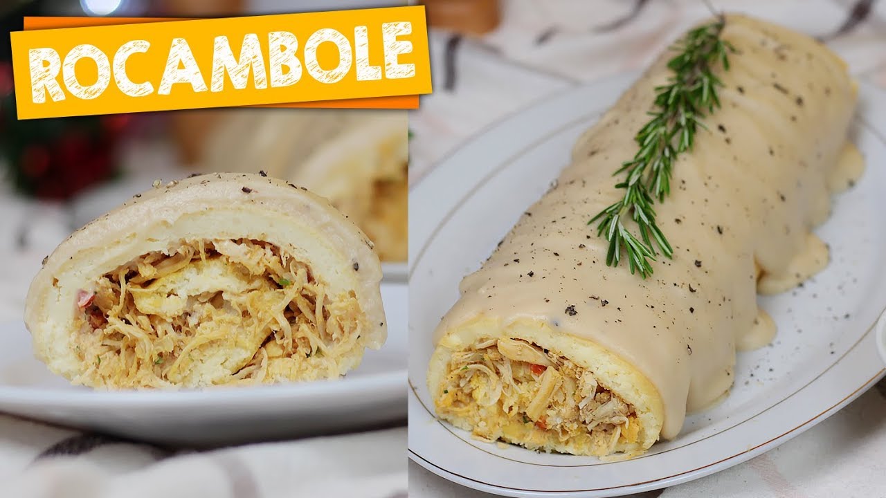 - Espalhe no rocambole uma camada de requeijão, em seguida acrescente o presunto e a muçarela sobre o requeijão. Enrole como um rocambole. Passe molho de tomate ou outro molho de sua preferência e polvilhe o queijo parmesão. Leve novamente ao forno, somente para gratinar. Sirva em seguida.