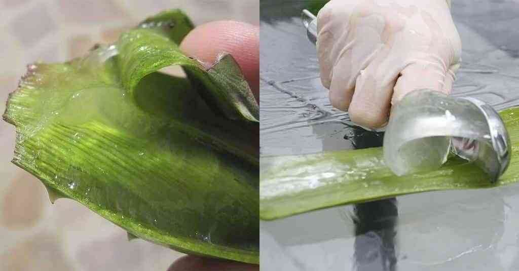- Faça o mesmo com a folha de babosa, retire todo o gel (visível no interior da planta), sendo esta a parte principal para esta terapêutica.