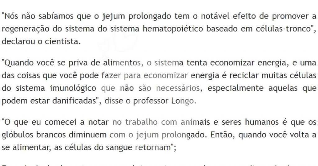 Quando fazemos jejum, os corpo tenta economizar energia ao máximo, e essa economia de energia fará uma renovação das células de defesa do corpo, pois as que não mais necessárias e as mais fracas, serão descartadas.