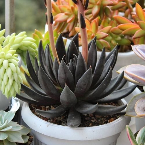 São chamadas de suculentas pretas, ou suculentas negras, as espécies dessas plantas que possuem folhas em tons de roxo-escuro ou de preto. Além da beleza clássica desse tipo de planta, elas se destacam por causa da cor, que é incomum de se ver. Veja alguns exemplos, que podem ser encontradas para cultivo em lojas on-line de mudas.