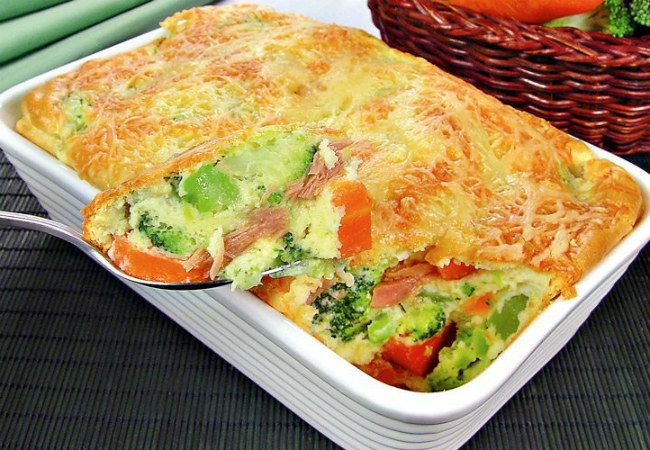 - Coloque os legumes refogados numa forma. Misture levemente a clara em neve e o creme. Jogue por cima dos legumes e leve ao forno preaquecido até gratinar.