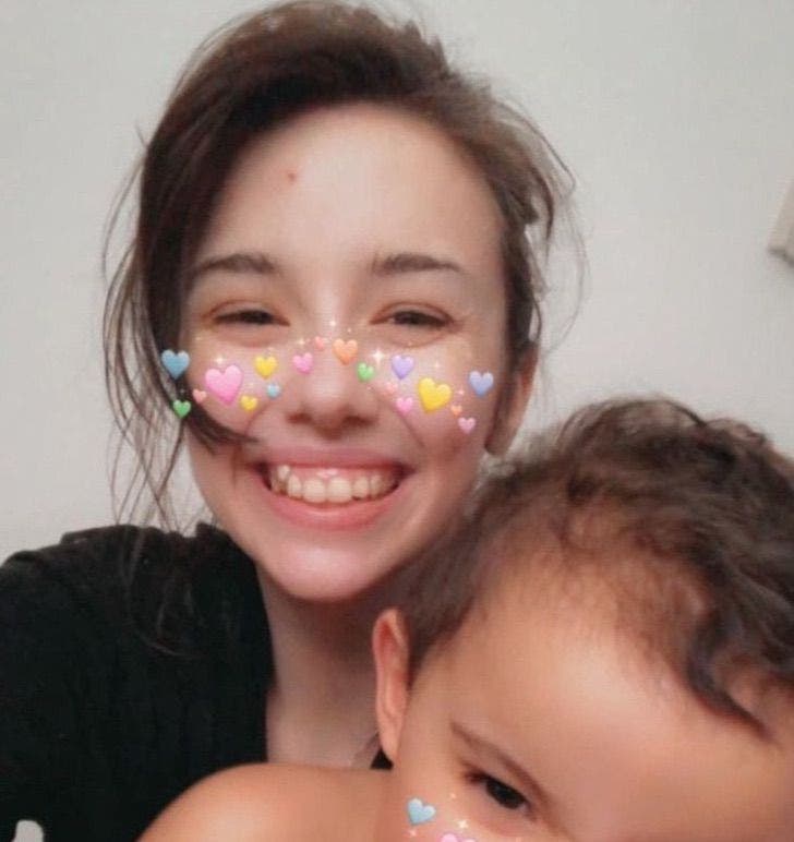 “À esquerda, estou completamente destruída, pesando 42 quilos, morando na rua, vivendo assustada e sofrendo, pronta para terminar minha vida. Tive duas vezes uma infecção no coração devido às substâncias que usava e um buraco no coração. Minha mãe tirou essa foto quando veio me salvar.