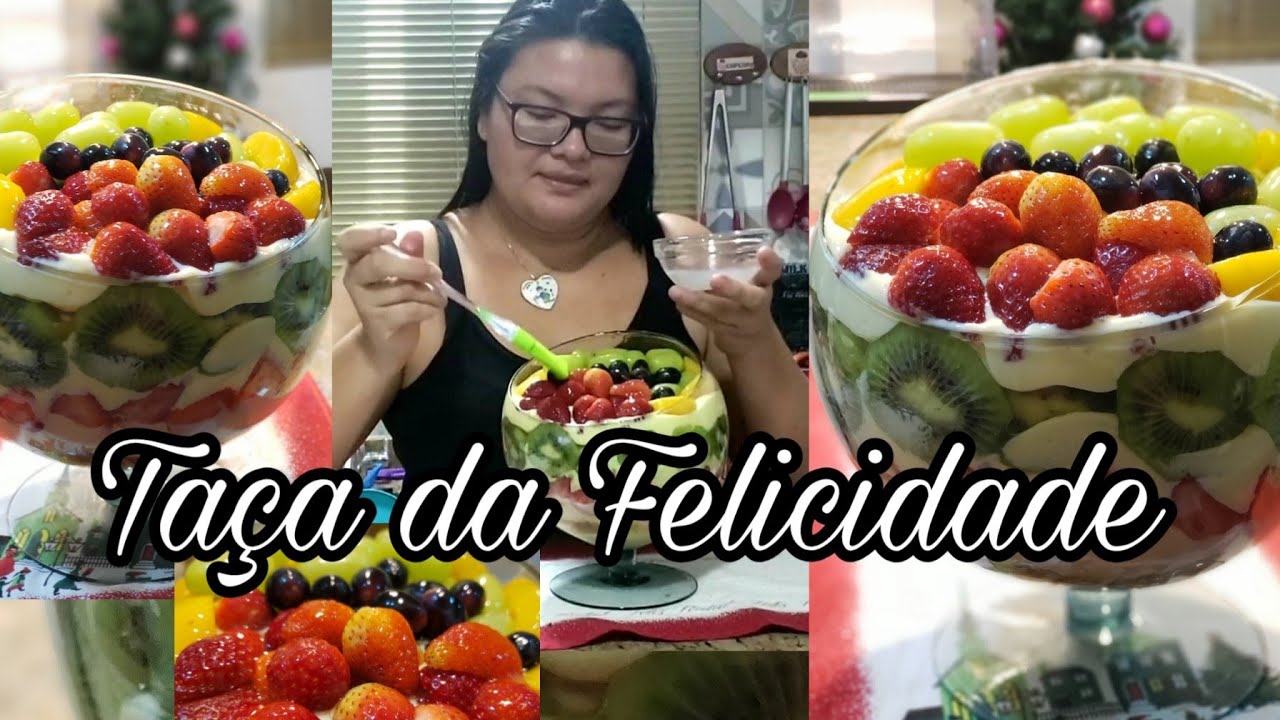 A taça da felicidade é uma sobremesa com creme, biscoitos e frutas frescas para servir bem geladinha em uma taça grande bem bonita. É o tipo de doce para colocar na mesa em datas especiais, mas é claro que você pode fazer para ter em casa no fim de semana e deixar todo mundo comer à vontade. A receita é bem fácil de fazer e você pode variar conforme as frutas da estação. A dica é deixar a taça bem colorida para ser mais apetitosa.