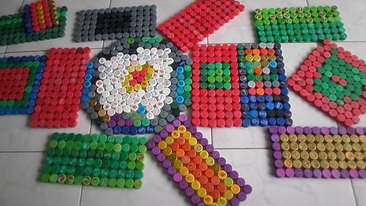 7. Tapete artesanal com tampinhas plásticas e caixa de pizza