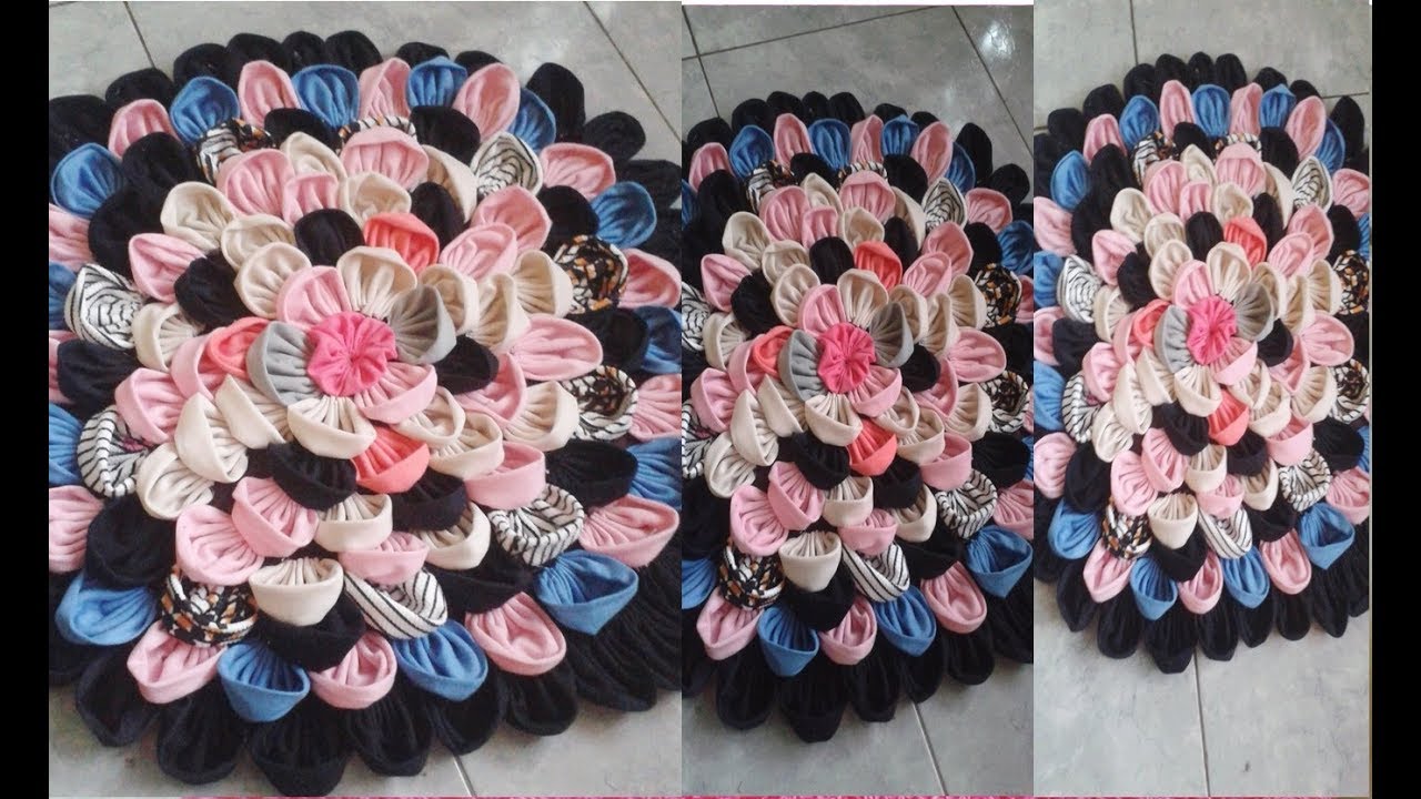 Você já viu um modelo anterior feito com retalho de tecidos, mas com uma técnica de transpassado. Esse tapete é feito com pétalas de retalhos para deixar o visual diferente. Depois de fazer a mais simples, tente fazer essa ideia também.