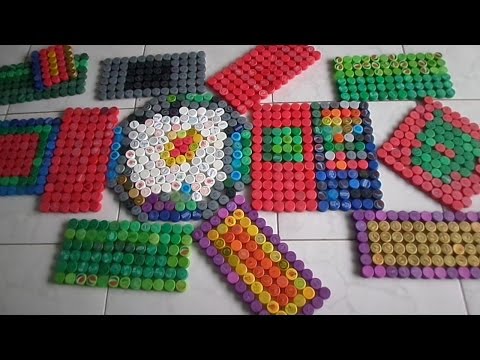 7. Tapete artesanal com tampinhas plásticas e caixa de pizza