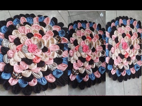 Você já viu um modelo anterior feito com retalho de tecidos, mas com uma técnica de transpassado. Esse tapete é feito com pétalas de retalhos para deixar o visual diferente. Depois de fazer a mais simples, tente fazer essa ideia também.