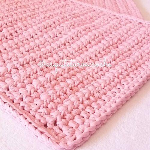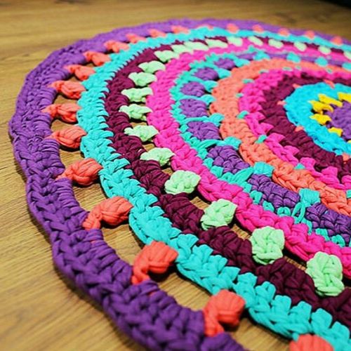 Quem sabe fazer crochê pode aplicar os pontos usando diferentes materiais, como os retalhos de tecidos. Os pontos podem ser feitos à mão mesmo para um tapete de tamanho maior e retalhos mais largos. Fica lindo e personalizado.