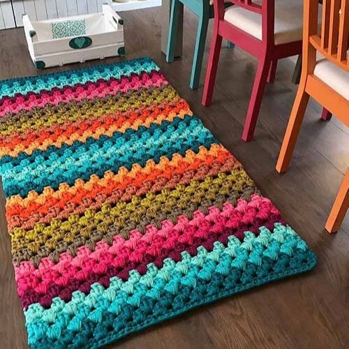 Para receber os amigos calorosamente, um tapete bem colorido na frente da porta fica lindo, claro, se combinar com a sua decoração. É um modelo fácil de fazer, resistente e fácil de lavar, então só tem vantagens.