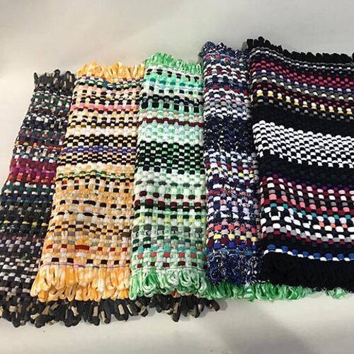 Esse modelo é um dos mais populares entre os tapetes de retalhos, muitas vezes vendidos pelos vendedores ambulantes que passam de casa em casa e oferecem o jogo para cozinha com um tapete grande para a pia e mais dois ou três pequenos. Os retalhos são transpassados em fios de arame.