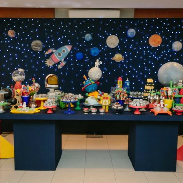Para os meninos encantados pelo espaço, esse tema faz uma festa muito bonita. Você pode apostar em foguetes, roupa de astronauta, estrelas, planetas, lua, luzes de LED para simular um céu noturno e vários outros elementos que combinam com a temática. O azul-marinho é a cor principal.