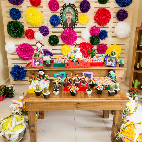 As mamães que ensinam sobre a história da artista para as meninas podem usar esse tema lindo, pois elas vão amar. Dá para usar elementos que representam o México e a vida da Frida.