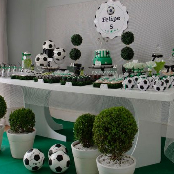 Essa é outra temática que nunca vai sair de moda para as festas de meninos. Você não precisa usar o tema de um time em específico, apenas utilizar bolas, muito verde, campinhos de futebol, bonequinhos de jogadores e afins. Claro, se tiver um time do coração na família, com certeza a festa será ainda mais bonita.