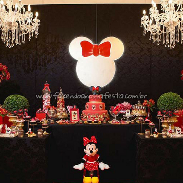 Já para uma festa mais clássica, mas que também nunca sai de moda, a Minnie é a queridinha das crianças e das mamães, pois fez parte da infância de todas. As festas de Minnie são feitas em preto, vermelho e branco, mas nada impede de fazer rosa e branco, com muita graciosidade e é bem fácil de montar um cenário, mesmo que por conta própria.