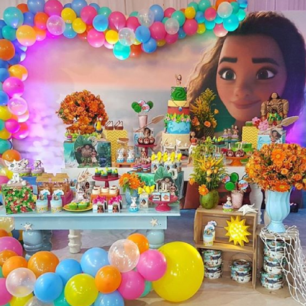 Outra personagem que as meninas adoram é a Moana, do filme da Disney. A festa com essa temática tem as características de praia, mar, verão, sol e pode envolver elementos como estrelas do mar, redes de pesca, flores, animais e cores vivas. É uma temática especial para as meninas de personalidade forte que se identificam com a nova princesa.