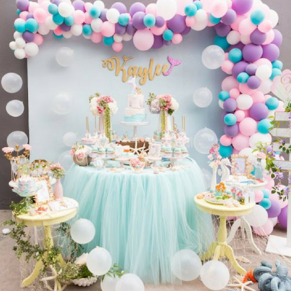 A festa na temática sereia utiliza as cores semelhantes à temática do unicórnio, mas o personagem é bem diferente, então vale a pena consultar o gosto da criança. As sereias estão em alta no mundo adulto também, e de fato as tonalidades de rosa, azul, roxo, verde e perolado, tudo translúcido, cria uma atmosfera encantadora.