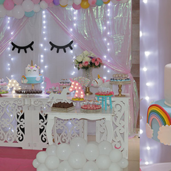 O tema unicórnio está em alta para as meninas de todas as idades. É uma temática graciosa, com cores delicadas, alegre e que permite explorar vários elementos do universo lúdico. Na festa de unicórnio use e abuse de arco-íris em tons claros, iluminação suave e flores.
