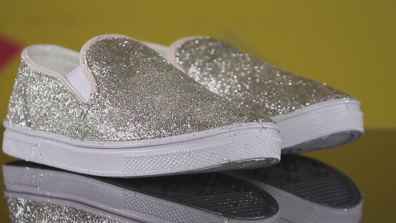 Essa é uma ideia mais fácil para aplicar em tênis com modelo sem cadarço e em toda a parte de tecido. Você só precisa colocar o sapato sobre uma cartolina ou tecido para evitar espalhar glitter pelo piso, depois aplicar cola nele todo e passar o glitter em tudo onde tiver cola.
