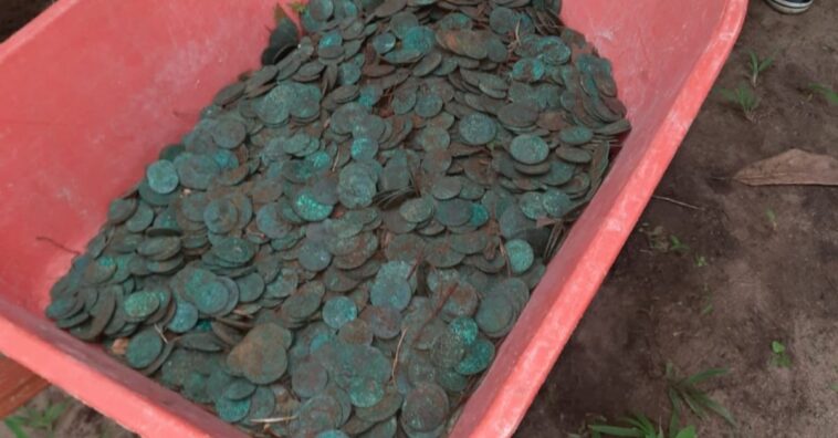 O que aconteceu foi que um homem chegou à casa da idosa se dizendo professor de história e portando um detector de metais. Acompanhado de outras pessoas, eles começaram a escavar o terreno e encontraram dezenas de moedas, algumas com data de 1819, que possuem um valor de mercado de até R$ 15 mil cada uma.