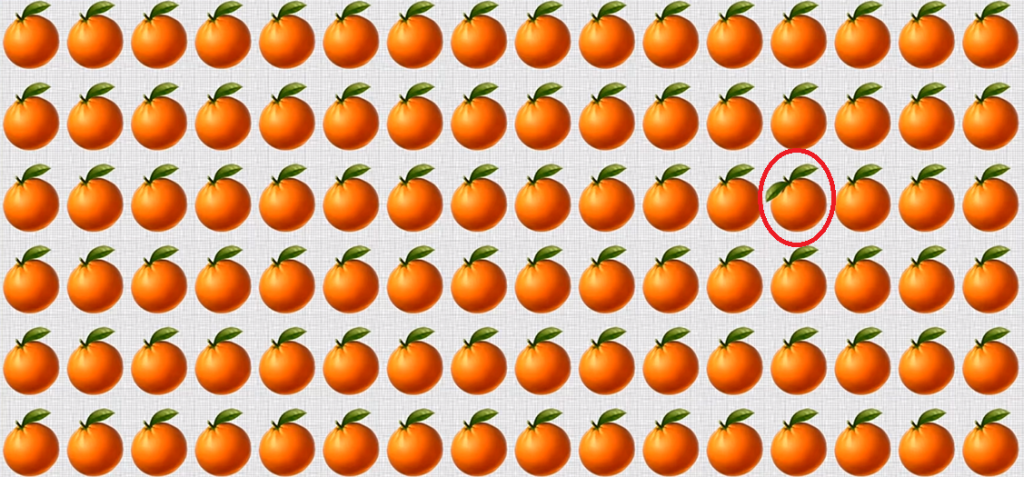 Esse teste visual é uma ilusão de ótica bem legal para ver como está o seu nível de atenção e concentração. A sua tarefa é visualizar a imagem abaixo e encontrar a única laranja que tem um detalhe diferente das outras. Você tem 15 segundos para completar essa tarefa.