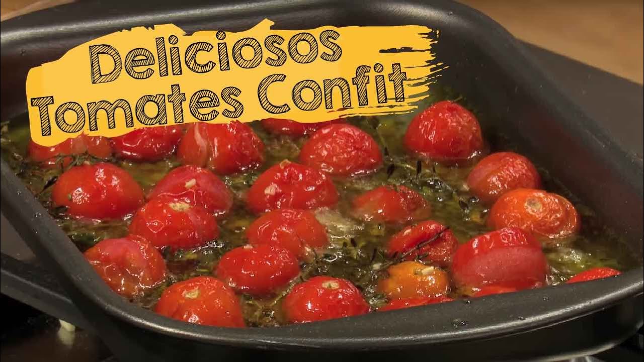 O tomate confit é uma forma de fazer tomates assados, mas que é tipo uma conserva que você pode manter na geladeira para servir como salada ou para adicionar em receitas variadas. Dá para fazer com tomates grandes ou cereja, e leva bastante azeite, ervas frescas a gosto, um pouco de sal, pimenta, alho e outros temperinhos que gostar.