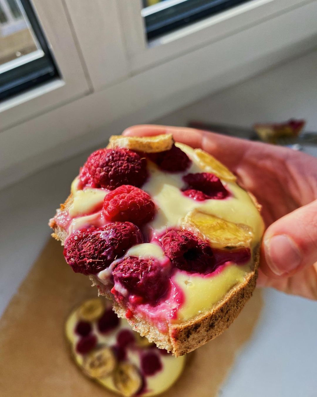 Parece um creme de pasteleiro, mas essa torrada foi feita com ovo, iogurte grego, extrato de baunilha, frutas frescas, mel de baunilha e um pouco de açúcar em pó para finalizar.