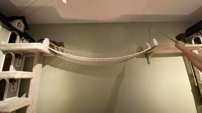 Ao invés de apenas deixá-los à vontade para subir nos móveis, ele resolveu construir duas lindas torres, cheias de conforto, detalhes e acabamentos, para colocar na sala, ligadas por uma ponte pênsil.