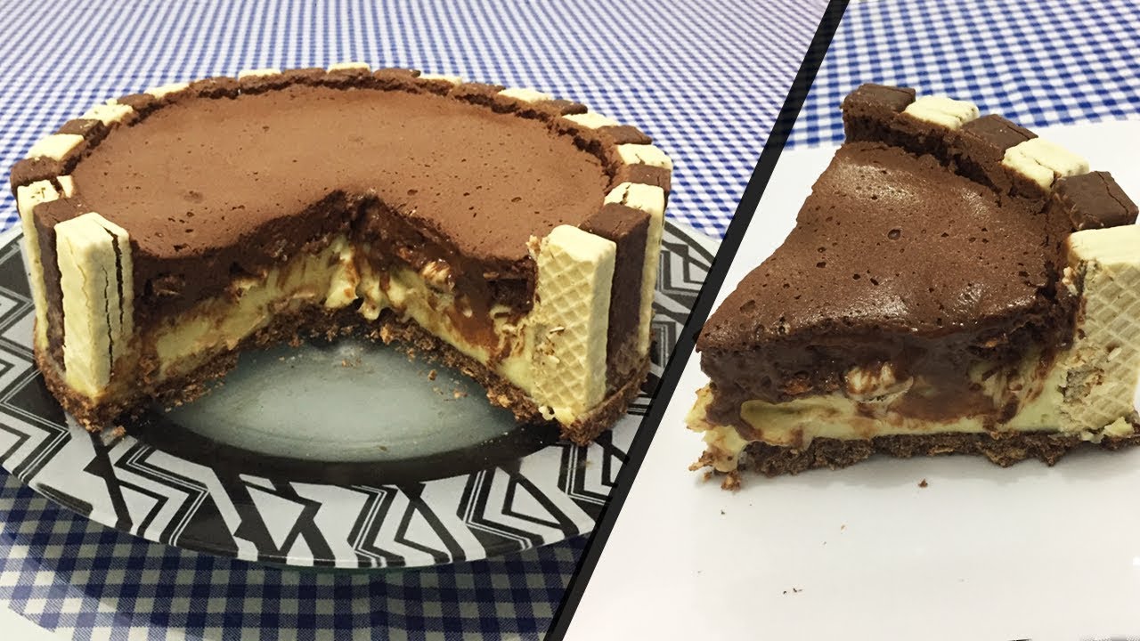 Essa é mais uma verdadeira perdição de torta. Leva uma base de Bis triturado, um recheio de creme de leite condensado com chocolate branco, e tem ainda uma cobertura de mousse de chocolate.