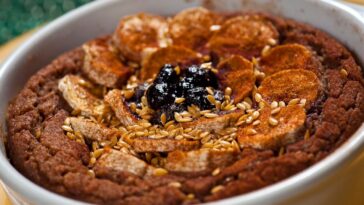 - Despeje sobre a banana e leve ao forno, preaquecido, por 30 minutos ou até dourar levemente.