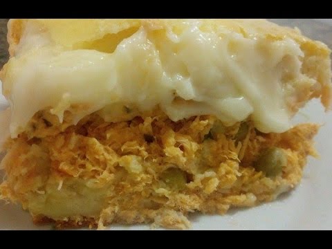 5. Unte uma forma com óleo e despeje metade da massa. Cubra-a com o recheio todo e espalhe-o bem. Cubra todo o recheio com o catupiry e finalize a montagem da torta com o restante da massa.
