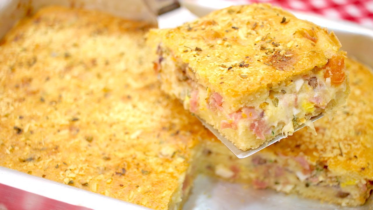 - Coloque o recheio de queijo, presunto, tomate e ovos, e cubra com o restante da massa.