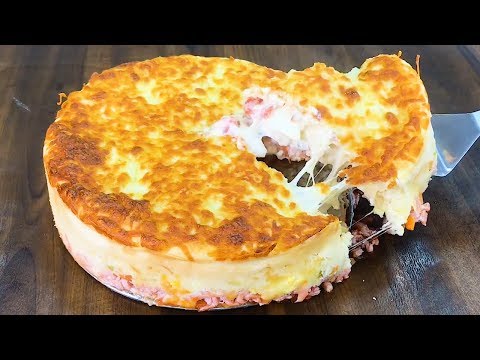 - Coloque o recheio de queijo, presunto, tomate e ovos, e cubra com o restante da massa.