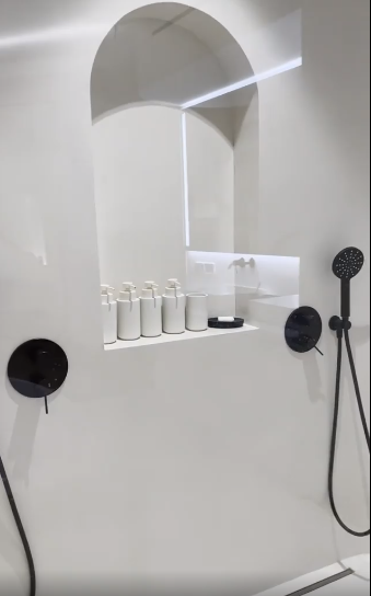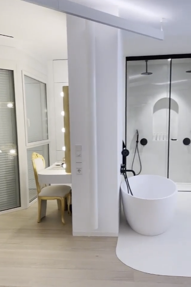 O banheiro de Simaria é diferente, pois a parte da pia e a banheira ficam no mesmo ambiente de dormir, sem parede divisória. Apenas o chuveiro e o vaso sanitário ficam em portas separadas.