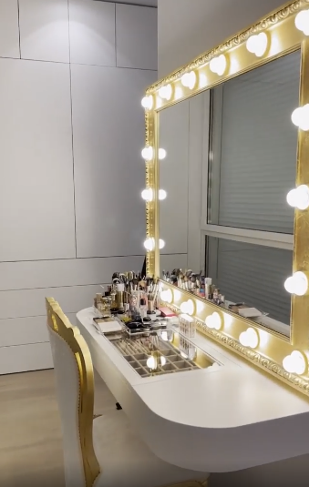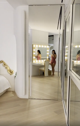 Por todo o quarto há vários espelhos, e por trás de todos eles estão os armários. Como o quarto tem uma decoração minimalista, muito leve e clara, os espelhos refletem essa leveza.