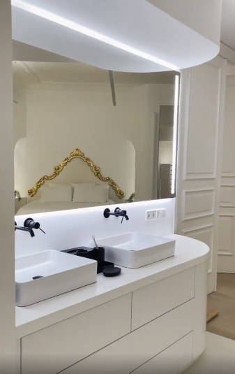O branco é a cor predominante, com detalhes em dourado, preto e madeira clara. A iluminação embutida e indireta deixa o ambiente muito aconchegante, pois pode ser controlada por controle remoto para ficar mais intensa ou suave.