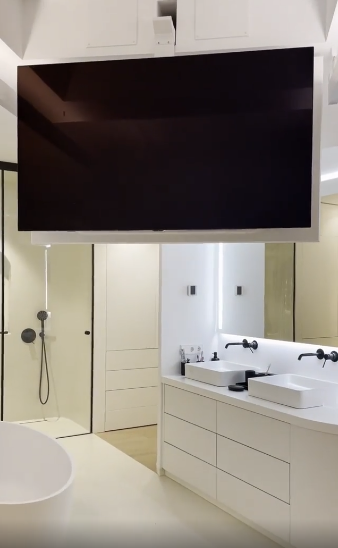 A televisão também é acionada por controle remoto e desce do teto. A cantora mostrou como tudo funciona, sempre frisando sua gratidão por mais essa conquista na vida.