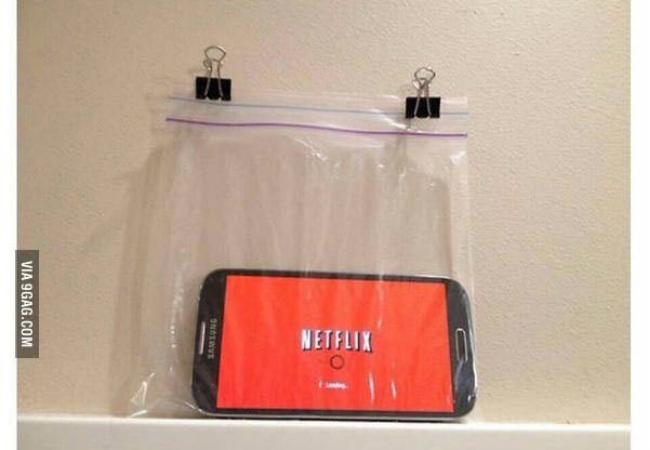 Se você tem que tomar banho, mas não quer perder tempo para assistir só mais um episódio da sua série favorita, ou quer deixar o seu banho ou o das crianças mais divertido, tem solução. Para isso coloque o seu celular dentro de um saco com fecho hermético e o feche bem. Depois é só usar dois prendedores de papel para pendurar.