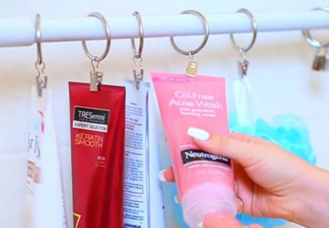 Basta comprar um bastão que seja regulável, para encaixar perfeitamente, e acoplar prendedores aos anéis da cortina. Assim você pode prender os seus produtos de banho nos pregadores, deixando-os fora do chão e fáceis de alcançar.