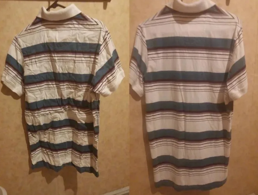 Então, uma dica rápida, caso não tenha um ferro de passar roupa por perto, é colocar a peça em um cabide e deixar no banheiro durante o seu banho quente.