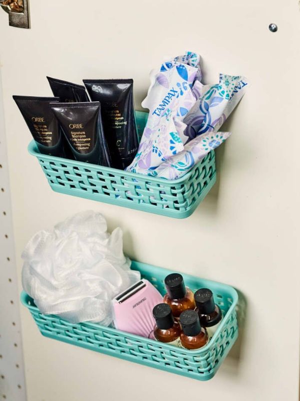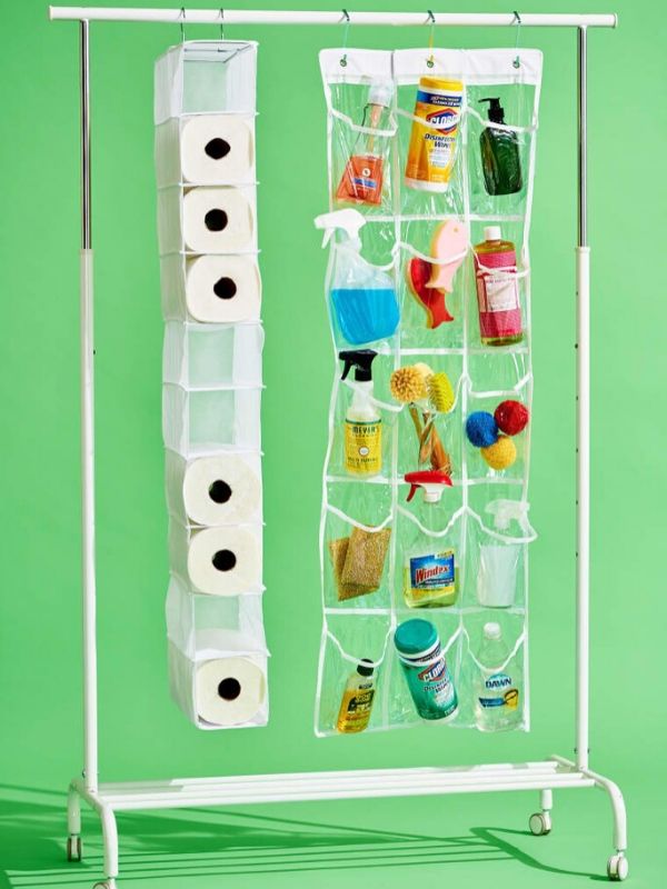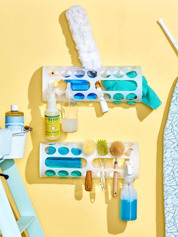 Esses organizadores de parede são úteis de várias formas, pois você pode colocar itens dentro ou pendurados do lado de fora. Na lavanderia eles são sensacionais, pois mantêm os objetos de limpeza arejados e secos.