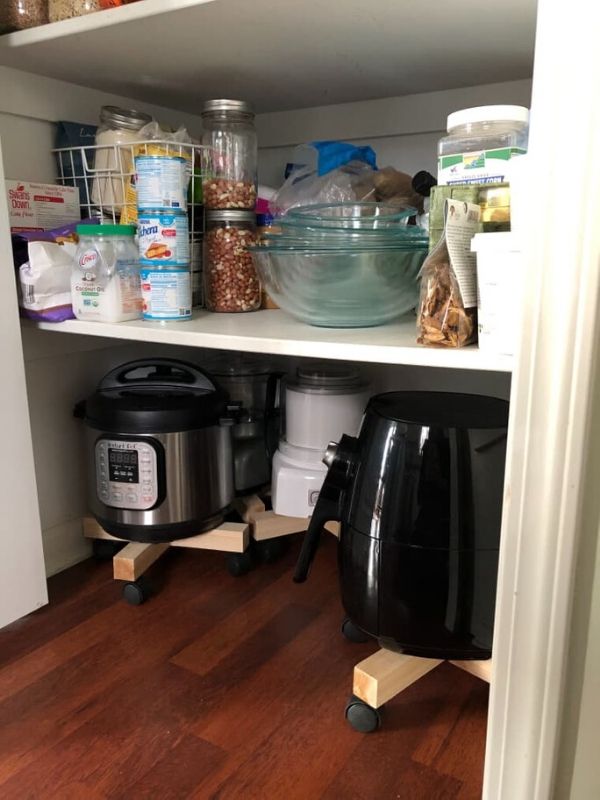 Se você não tem espaço no armário nem na bancada para guardar máquina de fazer pão, panela elétrica e outros itens de médio porte, use suportes com rodinhas e arrume um cantinho no piso para armazená-los.
