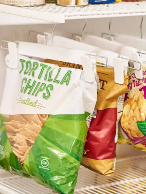 Sim, você encontra pequenos cabides com grampinhos, tipo aqueles de pendurar roupas íntimas nas lojas, para colocar seus pacotes de alimentos abertos.