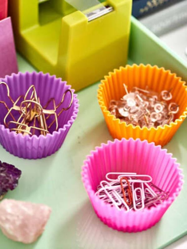 No seu home office, as forminhas de muffins podem ser bem úteis na hora de organizar objetos pequenos.