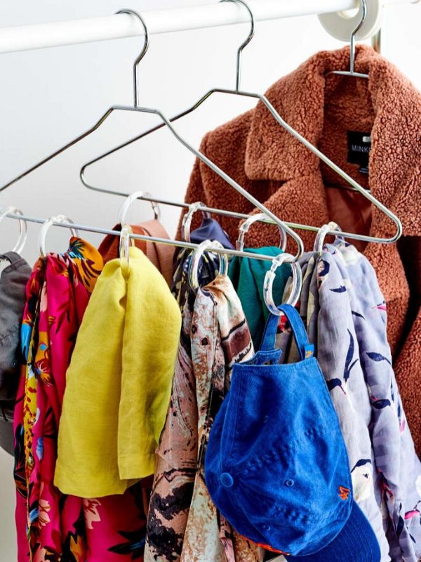 Já tinha pensado em usar seus cabides de roupas com muito mais funcionalidade? Pendurando neles várias argolas de cortina é possível organizar todos os seus lenços e bonés.