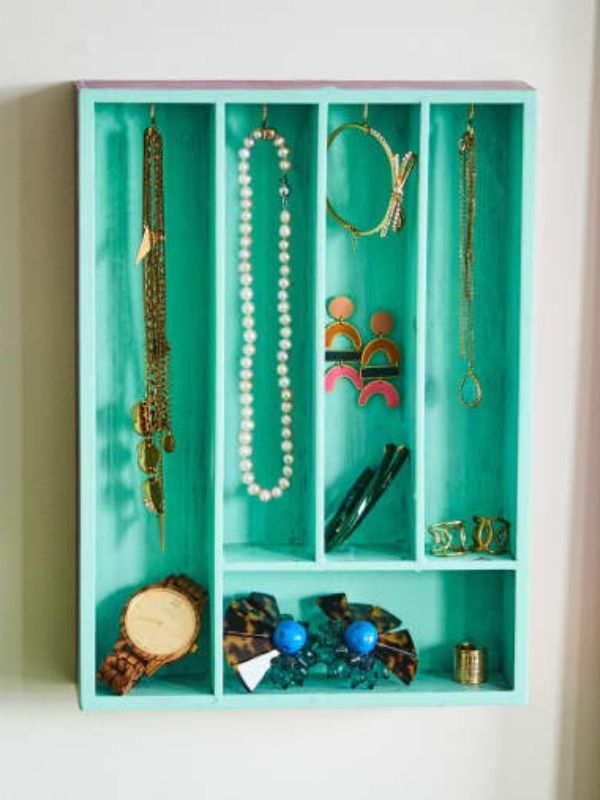 Para evitar que todas as bijus fiquem misturadas dentro de uma caixa, pegue um porta-talheres de madeira, coloque ganchinhos, pinte do seu gosto e pendure na parede. Ou pode só deixar sobre a penteadeira mesmo, pois já vai deixar as bijus bem mais organizadas com essas divisórias.