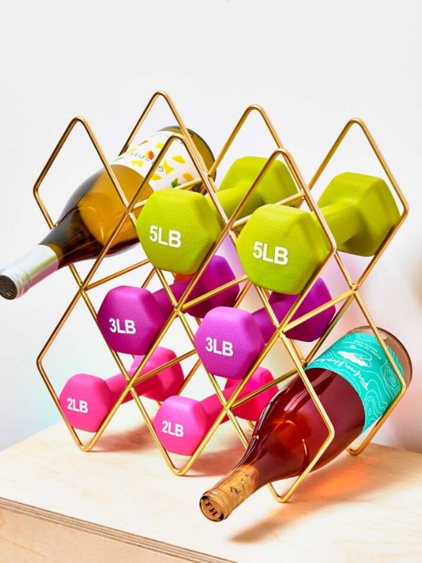Um porta-vinhos pode ter outra utilidade, caso você goste de malhar em casa, mas não tenha onde guardar os seus halteres. Ideia genial!