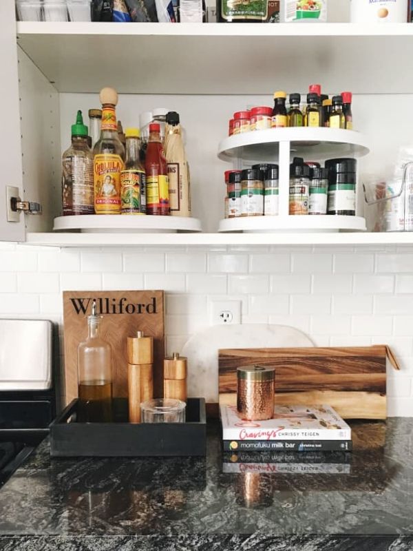 Para não precisar retirar vários temperos do armário até encontrar aquele lá no fundo, use organizadores giratórios.
