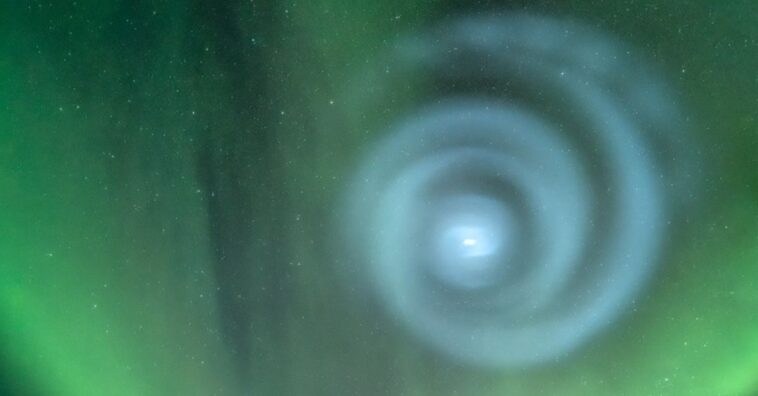 Observar de perto as auroras boreais deve ser maravilhoso. Se você já viu por fotos e vídeos, imagina como seria ver pessoalmente. Um fotógrafo estava registrando a beleza das auroras quando uma espiral misteriosa se formou sobre o Alasca.