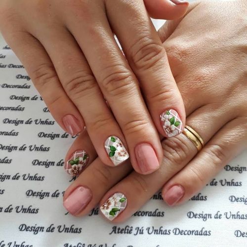 Geralmente as unhas curtas decoradas são feitas com cores mais claras e desenhos delicados. Combina melhor com o comprimento da unha, evitando excesso de informação em um espaço tão pequeno para pintar.