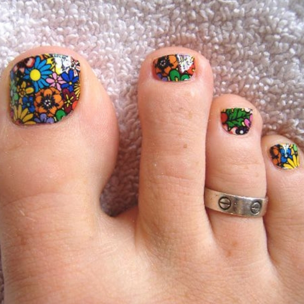 Mais um modelo com adesivos para unhas. Muitas flores, bem miudinhas e coloridas, demonstram um espírito jovem e alegre.